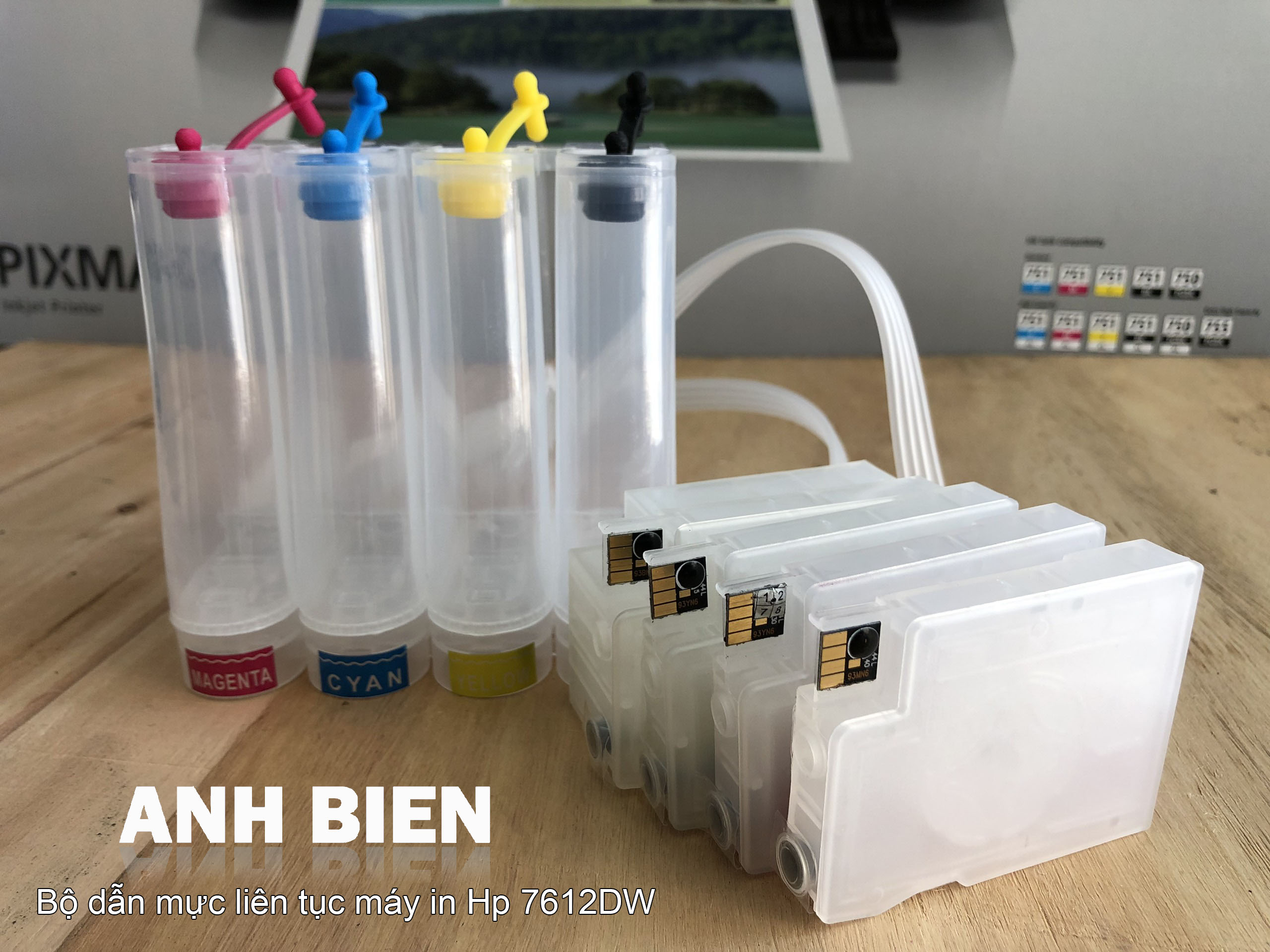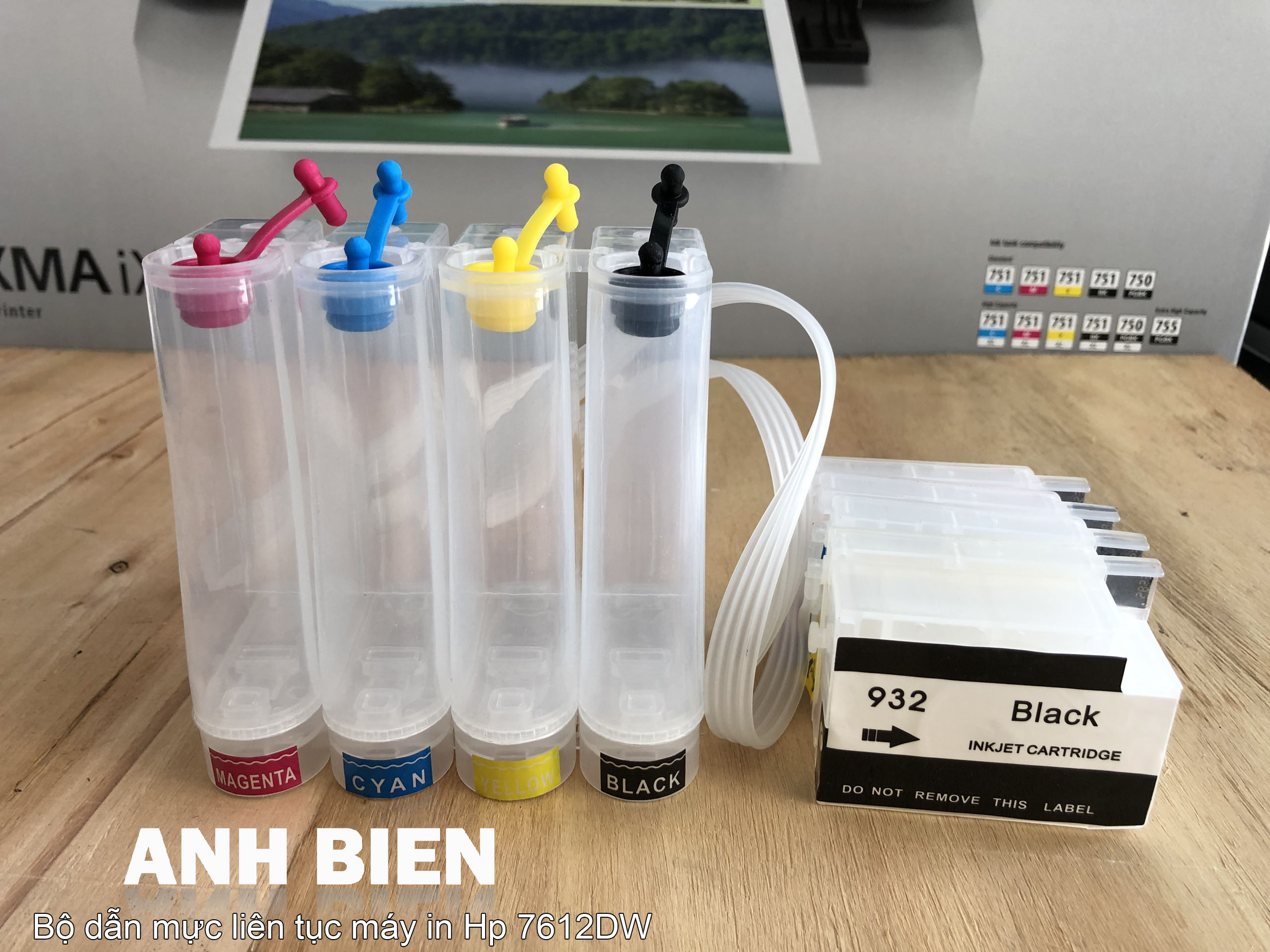 Bộ dẫn mực liên tục Máy in Hp Officejet 7612 sử dụng 4 bình mực dung tích 100ml/1 màu: Đỏ, Đen, Vàng, Xanh. Bộ dẫn mực bao gồm bình chứa mực + dây dẫn + cartridge mực + chíp out.